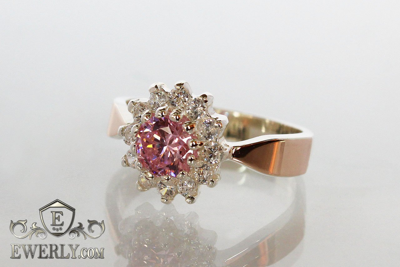 Жіноче срібне кільце із золотими вставками та рожевим фіанітом у центрі