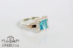 Вишукане кільце з виразним квадратним фіанітом ніжно-блакитного відтінку, обрамленим розсипом сяючих білих каменів меншого розміру.